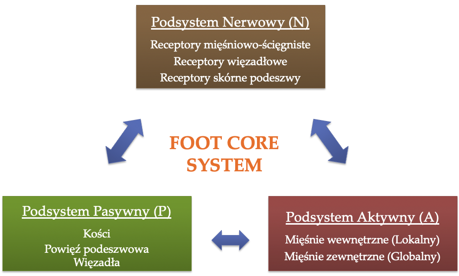 McKeon i wsp. (2015) zaproponowali interesujące podejście do analizy funkcji stopy, przedstawiając koncepcję tzw. Foot Core System. Nawiązuje ona do popularnego pojęcia „core” (z ang. ‘rdzeń’, ‘centrum’), odnoszącego się zwykle do tułowia. W ich ujęciu „core” stopy składa się z trzech komponentów: nerwowego, aktywnego oraz pasywnego.