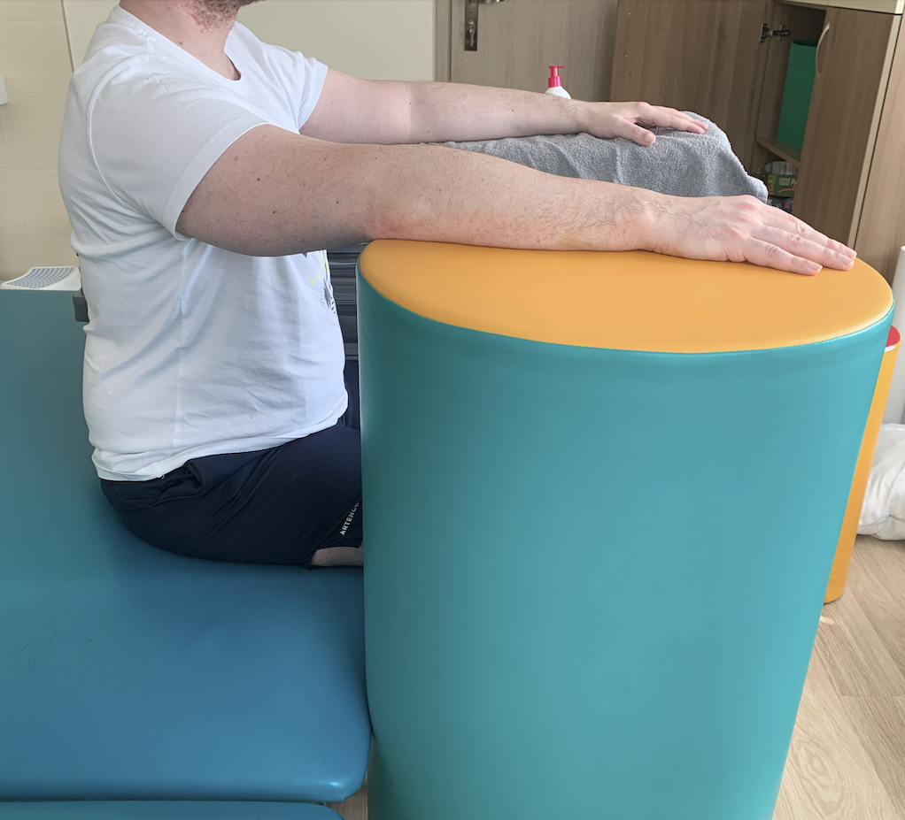 Pracując z pacjentem z przeczulicą, czyli sytuacją w której pacjent odbiera neutralny dotyk jako bodziec bólowy możecie zrobić pewien test. Najpierw popracujcie swoimi rękoma bezpośrednio na skórze pacjenta. Możecie wtedy usłyszeć syczenie, przekleństwa albo uwagi, że pracujecie za mocno. Później zróbcie to samo ale przez ręcznik (Ryc. Nr 6). Jest to jeden ze sposobów z których korzystam. Mój nacisk jest bardziej głęboki, korzystam z kompresji i pracuję powoli. Wielu pacjentów zgłosi Wam, że ten bodziec nie jest już aż tak nieprzyjemny i można spokojnie pracować dalej. Możecie wtedy wykorzystać te same sposoby stymulacji, które opisywałem wcześniej. Po odpowiedniej stymulacji czuciowej następnym etapem jest wprowadzenie aktywności ruchowej – np. torowanie wspięcia na palce z pronacją przodostopia :-).